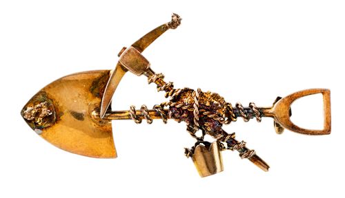 PICK AND SHOVEL BROOCH, in gold (9ct; 3.80g; 46x23mm), no maker, features a crossed pick and shovel with a small nugget on the shovel and on the pick, and all wrapped with a miner's rope and with a bucket hanging below, pin-back, with unofficial box. Dark toned, otherwise very fine.