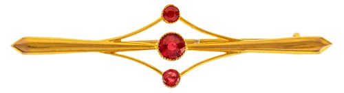 BROOCH, in gold (9ct; 2.95g; 52x14mm), attributed to Aronson & Co, features a thin bar and in the centre are three red gemstones, two small and one larger size, pin-back with loop provision for safety chain. Extremely fine.