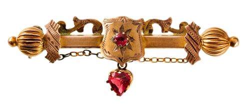 BROOCH, in gold (9ct; 2.12g; 48x17mm), attributed to maker, Willis & Sons, features a highly decorated bar with a shield in the middle and this with a small claw set red gemstone in the centre, below the shield is another heart shaped and claw set red gemstone and with two curved chains from each side of the bar to the base of the shield, pin-back. Toned very fine.