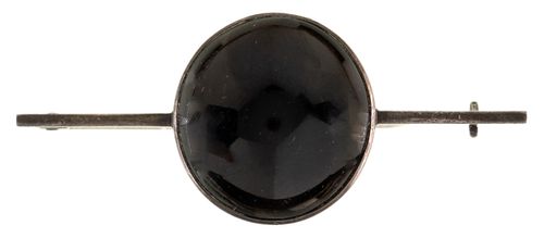 BROOCH, in silver (tot wt 8.37g; 56x23mm), by Stevenson (Bros), features a thin bar and in the centre is a silver framed domed circular black stone, pin-back, with unofficial box. Good very fine.