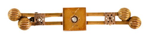 BAR BROOCH, in gold (15ct; 3.23g; 51x9mm), attributed to maker, Aronson & Co, features a decorated double bar with a square in the middle and this with a clear small gemstone in the centre, pin-back. Very fine.