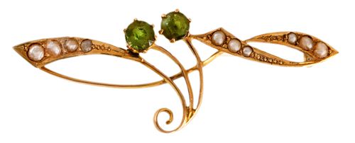 SCROLL BAR BROOCH, in gold (15ct; 2.65g; 45x17mm), attributed to maker, Aronson & Co, features a scrolling bar containing ten seed pearls and at the top are two claw set green gemstones, pin-back. Good very fine.