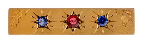 BAR BROOCH, in gold (9ct; 4.35g; 44x9.5mm), by (A.) Macrow (& Sons), features an engraved decorated bar with two blue gemstones and one red centre gemstone claw set in engraved star shaped sections, pin-back. Extremely fine.