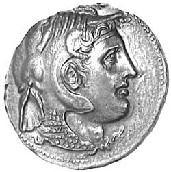 EGYPT, Kingdom of, Ptolemy I (323-283 B.C.), silver tetradrachm, (15.7 grams), issued 310-305 B.C., obv. head of Alexander with horn of Ammon, clad in elephant skin and aegis, to right, rev. **ALEXANDPOU on left, Athena Alkidemos to right with spear and shield, KP monogram on right, above helmet, below lower right eagle to right, (cf.S.7750, Sv.164). Attractive red and blue tone, nearly extremely fine and rare.