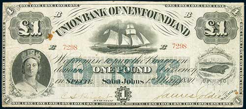 UNION BANK OF NEWFOUNDLAND, one pound, Saint Johns (Newfoundland), 1st May 1880, No.7298, imprint American Bank Note Co. N.Y. (Charlton 750-14-06). Several rust spots, flattened of folds and creases otherwise good fine.