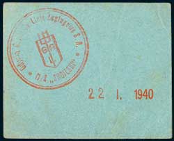 NEW ZEALAND TROOPSHIP CARD CURRENCY, issued on the M.S. Sobieski for one penny, c.1940, blue cardboard, 'One Penny New Zealand Currency Redeemable only during the voyage for which issued' No.61, stamp dated on back 22.1.1940, together with circular red ship stamp, (Sutherland 273 [p.193-4], Robb p.44 [illustrates example]). Very fine and very rare.