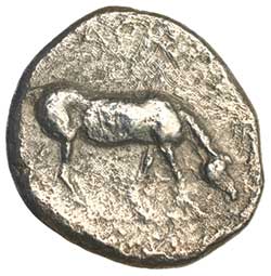 THESSALY, Larissa (under Macedonian domination), (350-325 B.C.), silver drachm, (5.598 grams), obv, facing head three-quarter to left of nymph Larissa, within dotted border, rev. horse grazing to right, with head down eating, curved above **[L]APIS[A]*, plain exergue, (S.2120, Lorber, head type 25, No.79.3/80.1, (p.273), Pozzi 1222 [same obverse die]). Slightly off centre on the obverse with full flan on reverse, reverse porosity, otherwise good very fine/fine, rare with and a mule of known dies.
