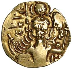 This is a further development of the deteriation of the stylised Kushan type coinage that continued for another 500 years in the coinage of Kashmir until the advent of Muslim rule.