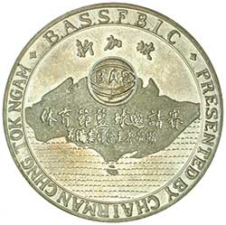 SINGAPORE, one hundred and fiftieth anniversary silver presentation medal, 38mm, obv. view of Singpaore, rev. map with B.A.S.S.F.B.I.C., Presented by Chairman Ching Tok Ngam. Extremely fine.