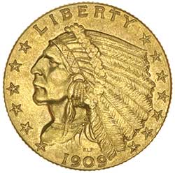 U.S.A., two and a half dollars or quarter eagle, 1909, Indian head. Nearly extremely fine.