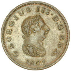 GEORGE III, copper halfpenny, 1807, (S.3781). Brown and trace of mint red, good extremely fine. ...