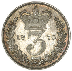 QUEEN VICTORIA, young head silver threepence, 1873, (S.3914C, ESC 2079). Light golden peripheral tone, good extremely fine.