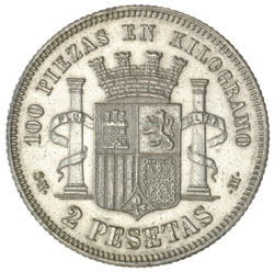 SPAIN, Provisional Government, silver peseta 1870 (73), two pesetas 1869 (6a) (illustrated) and five pesetas 1870 (KM.653, 654, 655). Very fine; good extremely fine; very fine. (3)