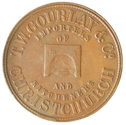 GOURLAY, T.W. & Co., Christchurch penny, undated (A.150;L.320). Reddish brown, good very fine and rare. ...