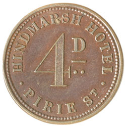HINDMARSH HOTEL, Adelaide fourpence check, undated, (A.248). Dark grey and brown toned, good very fine ...