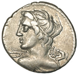 L. JULIUS BURSIO, (c.85 B.C.), silver denarius, Rome mint, (3.856 grams), obv. Genius (or Apollo ...