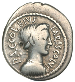 P. ACCOLEIUS LARISCOLUS, (43 B.C.), silver denarius, Rome mint, (3.526 grams), obv. Acca Larentia bust ...