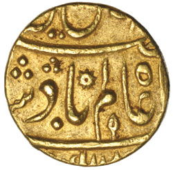 AWADH, in the name of Shah `Alam II, Muhammad, gold mohur, (10.89 grams), Banaras mint, year 10. AH 118X, (KM 38 for year 8 only and unpriced, [under Awadh]). With two small holes on edge, otherwise very fine and rare.