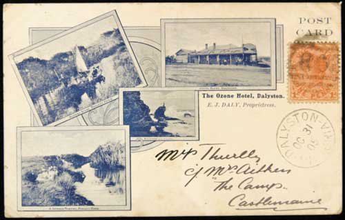 VICTORIA, group of topographical postcards all addressed to the same person in Castlemaine (1903-1905), includes postcard scenes from Dalyston, Heidelberg, Port Fairy, Rutherglen, Warburton, Wilson's Promontory, Phillip Island and Castlemaine, interesting group. Used. (9)