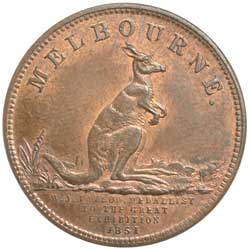 CROMBIE, Clapperton & Findlay, Melbourne halfpenny, undated (A.84) medal turn die axis. Some mint red, nearly uncirculated and very rare in this condition, one of the finest known.