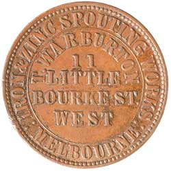 WARNOCK BROS, Melbourne & Maldon penny and halfpenny, 1861 (A.603, 604) penny, 1863 (A.605; H.265/1). ...
