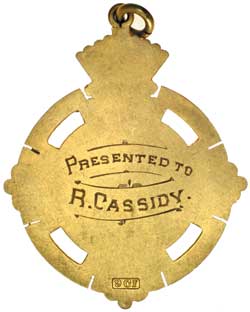 VICT. Polo Skating Assocn, handcrafted gold fob (9ct, 5.4gms, 34mm x 40mm) inscribed on obv 'Premiers / 1923 / Won By / Olympia' and on rev 'Presented to / R.Cassidy'; P.G.S (9ct, 4.3gms, 20mm x 28mm) inscribed on rev 'Swimming / Champ / 1934 / D.McFarlane'. Very fine,(2)