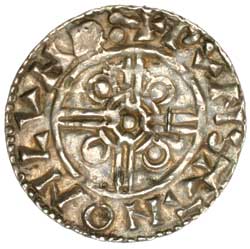 CNUT, (1016-1035), silver penny, pointed helmet type, issued 1024-1030, (1.028 grams), obv. pointed helmet bust left with sceptre, around CNVT R.X A.NG, rev, short cross voied, around PVNSTAN ON LVND., (Wynstan of London), (S.1158, N.787, Br.3, BMC xiv). Flan slightly wrinkled, otherwise good very fine.
