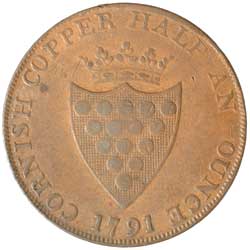 BEDFORDSHIRE, Leighton Buzzard, Chambers, Langston, Hall & Co's halfpenny, 1795 (D&H 3c) (2); Cambridgeshire, County issue, halfpenny 1795, (D&H 12), farthings Druid's head 1795 (2) (D&H 36), Newton (D&H 37), Cornwall, County issue, halfpenny 1791 (D&H 2) (illust), Falmouth, Volunteers halfpenny 1797, (D&H 3). Very good - nearly extremely fine. (8)