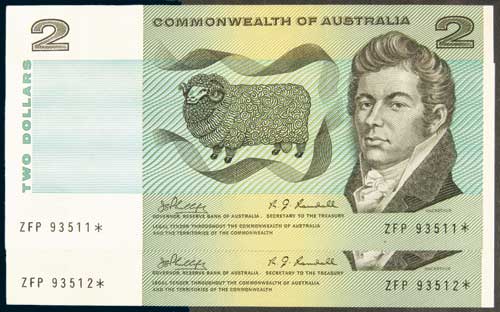 TWO DOLLARS, Phillips/Randall (1968) ZFR 64746/7 * (R.83s) consecutive pair. Adhesive smudge in same place ...