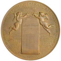 INTERNATIONAL UNIVERSAL EXPOSITION, Paris, 1878, commemorative medal in bronze (86mm) by Oudine, in case of issue, inside lid embossed in gold lettering 'Medaille Commemorative / Offerte / Pour / Services Rendus / L.Caubet Esq. / Commissaire de la Victoria'. Case damaged, medal with edge bump, nearly extremely fine.
