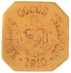 KEELING COCOS ISLANDS, ivory or bone token for fifty cents, serial 1235. Half paint off, good fine and rare.