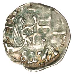 ROMANIA, Wallachia, Michael I, (1418-1420) silver denar, (0.40 grams), obv. standing figure of prince facing carrying floral crown with long tunic; holds lance in right hand and orb in left hand, around, Cyrillic legend around, rev. helmet surmounted by eagle to left, eagle holding Greek cross in beak, Cyrillic legend around. Very fine and rare.