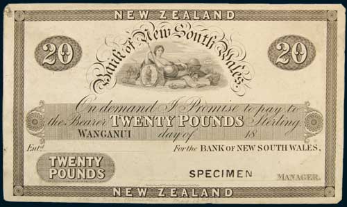 NEW ZEALAND, Bank of New South Wales, first issue uniface black and white, printer's proof, twenty pounds, Wanganui 18-, imprint Perkins, Bacon & Co London, Hardened Steel plate, pencilled lower margin 'approved from Dunedin May 13th/62' (P.S149). Nearly uncirculated and very rare.