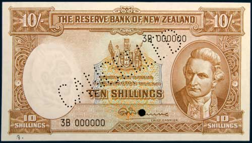 NEW ZEALAND, Reserve Bank, R.N. Fleming 1956-1967, specimen ten shillings, IJ 000000, overprinted in red ...