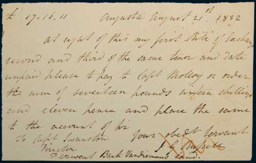 HANDWRITTEN BILL OF EXCHANGE, the first, issued at Augusta August 12st 1832 by J.G. Bussell ...