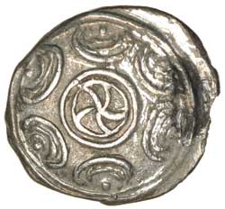 MACEDON, Pella (in name of the Bottiaians), (c.196-168 B.C.), silver triobol (1.632 grams), obv. Macedonian shield, with wheel like ornament at centre composed of five crescents, rev. stern of galley inscribed **BOTTEATWN*, (S.1438 [£75], BMC 1 [p.64], SNG Cop.137 [described as a two and a half obol coin]). Very fine, very scarce.