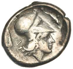 ILLYRIA, Epidamnos-Dyrrhachium (Colony of Corinth), (350-300 B.C.), silver stater, (8.114 grams), obv. Pegasos with pointed wing flying to right, rev. head of Athena to right in Corinthian helmet over a leather cap, **D* and club behind head, dolphin before helmet, (cf.S.1894, Calciati 22 [p.362], BMC 10, cf.McClean 5040). Worn with rough obverse surface, otherwise fine /very fine and a scarce mint.