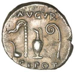 VESPASIAN, (A.D. 69-79), silver denarius, Rome mint, issue of A.D. 70-71, (3.392 grams), obv. IMP CAES VESP AVG PM, laureate head to right, rev. AVGVR TRI POT, simpulum, 'aspergillum', jug and lituus, (S.2281, RIC 29, RSC 42). Toned, uneven edges, otherwise good very fine.