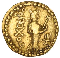 KANISHKA II, (c.A.D. 332-350), gold stater, (7.84 grams), obv. king standing, head turned left, holding ...