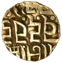 MADHYA PRADESH, Gahadavalas of Kanauj and Banares, Govindachandra (c.1114-1154) and his successors to 1193, gold stater, (3.976 grams), obv. four-armed Lakshmi seated cross-legged facing, circle of dots around central navel, rev. three lined Brahmi legend 'Srimad Ga / ngeya deva, (M.490). Very fine, scarce.