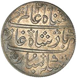 EAST INDIA COMPANY, Bombay Presidency, Machine struck issue, Surat Mint type, but struck at Calcutta 1823-1824, in the name of Shah Alam II (A.H.1173-1221, A.D. 1759-1806), Regnal Year 46, with complete impression of die and the date A.H.1215 (A.D. 1800), silver rupee, edge grained vertically, (Pr. 284, KM.221). Extremely fine and rare, with light gold tone.