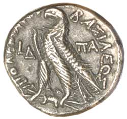 EGYPT, Kingdom of, Ptolemy IX Soter and Cleopatra III, (116-107 B.C.), silver tetradrachm, Alexandria mint, struck year 4 = 114-113 B.C., (13.50 grams), obv. head of Ptolemy to right with aegis, rev. eagle to left on thunderbolt with closed wings, to left L**D*, to right **PA*, around **BASILEWS [PTOLE]MAIOU**, (cf.S.7921, Sv.1665, SNG Cop.349). Uneven tone, good very fine and very scarce.