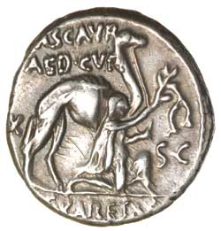 M. AEMILIUS SCAURUS AND P. Plautius Hypsaeus, (c.58 B.C.), silver denarius, Rome mint, (4.01 grams), obv. king Aretas kneeling beside camel to right, M.SCAVR and AED CVR above, [RE]X ARET[AS] in exergue, [E]X to left, SC to right, rev. Jupiter in quadriga to left, [P.HYPSAEVS] / AED CVR above, CAPTV on right, C.HYPSAE COS/ PREIVER in exergue, scorpion below horses, (S.379, Cr.422/1b, Syd.913, RSC Aemilia 8). Grey tone, good very fine and rare.