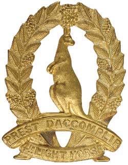 4TH LIGHT HORSE REGIMENT (CORANGAMITE LIGHT HORSE) 1930-1942, hat badge (52m x 38m), collar badges (29mm x 22mm [2]) in brass. Some discolouration lower part of wreath, extremely fine. (3)