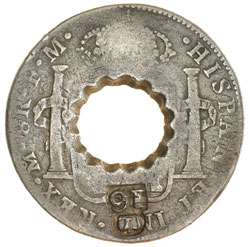 DOMINICA, 1813, silver 16 bitts, struck from a centrally pierced Charles IIII 1790F.M. (portrait of ...