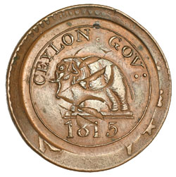 CEYLON, Ceylon Government pattern Fanam ( 1/12th rix dollar), 1815, struck over a copper Dutch V.O.C. doit (50.2 grains) (Pr 257 this piece). Good extremely fine and excessively rare.