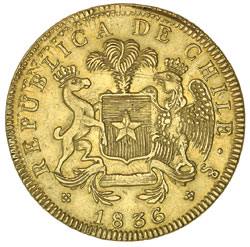 CHILE, Republic, gold ten pesos 1852, Santiago mint with Liberty standing, (KM.123). Nearly very fine. ...