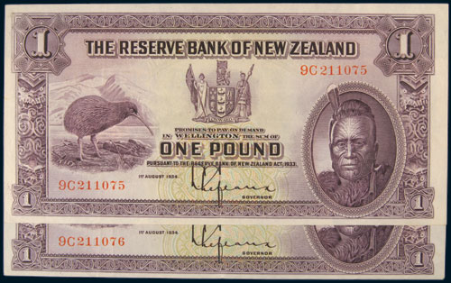 ONE POUND, 1st August 1934, number letter, 9C 21107/6, consecutive pair (L.604; P.155). Three vertical folds, good original body, extremely fine and rare as a pair. (2)