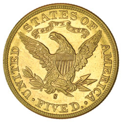 U.S.A., five dollars or half eagle, 1899 S, Liberty head. Nearly uncirculated.