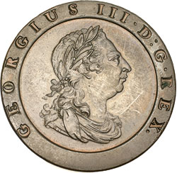GREAT BRITAIN, George III, copper cartwheel twopence, 1797 (S. 3776). Glossy dark brown, nearly extremely fine and scarce in this condition.